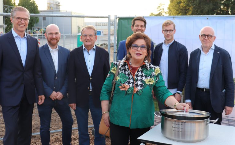 Ein Kochtopf gefüllt mit aktuellen Dokumenten diente als Symbol für den Baubeginn eines neuen, nach modernsten Standards geplanten Betriebsrestaurants am apetito Hauptstandort in Rheine. Die apetito Inhaberfamilie Düsterberg, der Aufsichtsrat und Vorstand sowie Vertreter des Planungsbüros kennzeichneten am 28. September 2021 damit den offiziellen Start des Neubaus. Das „EAT“ wird ein moderner Ort für Mitarbeitende und Gäste. Dabei steht „EAT“ für mehr als nur das für englische Wort „Essen“ – nämlich für Essen – Arbeiten – Treffen. Rund 20 Millionen Euro investiert die apetito AG in den Bau dieses multifunktionalen Gebäudes. „Vor ziemlich genau 40 Jahren standen mein Vater und Großvater an ähnlicher Stelle wie wir jetzt, um den Bau unseres jetzigen Betriebsrestaurants feierlich zu beginnen“, sagte Robert Düsterberg, Mitglied im Aufsichtsrat der apetito AG. „Auch das EAT wird ein Ort, an dem Menschen gerne zusammenkommen, um zu genießen, zu entspannen und um gemeinsam zu arbeiten und kreativ zu sein.“
