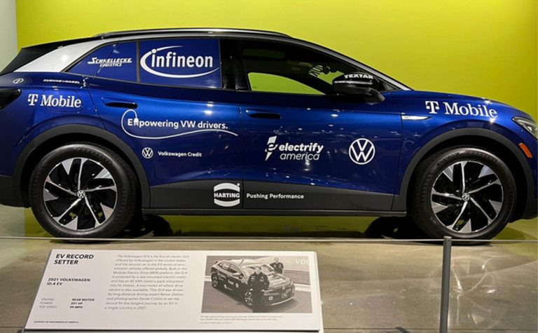 Espelkamp, Los Angeles (USA).  15. Februar 2022 — 2021 hatte ProfiLangstreckenfahrer Rainer Zietlow in knapp 100 Tagen rund 57.000 Kilometer mit einem Volkswagen ID.4 zurückgelegt, um der Welt zu beweisen, dass elektrische Fahrzeuge durchaus für große Distanzen geeignet sind. Sein E-Mobility-Roadtrip, unterstützt durch HARTING, quer durch die USA wurde mit einem Weltrekord gekrönt und ging in die Geschichtsbücher ein. Das originale Sieger-Auto ist bis Ende des Jahres Teil der Ausstellungsreihe „Driving Toward Tomorrow“ im Peterson Automotive Museum, LA.