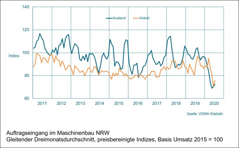 Im weniger schwankungsanfälligen Drei-Monats-Zeitraum Mai bis Juli 2020 sank der Auftragseingang um real 26 Prozent zum Vorjahr. Aus dem Inland kamen 17 Prozent weniger Bestellungen, die Auslandsaufträge blieben um 30 Prozent unter ihrem Vorjahresniveau. Dabei schrumpften die Orders aus den Euro-Ländern um 21 Prozent, aus den Nicht-Euro-Länder wurden 34 Prozent weniger Bestellungen verbucht.