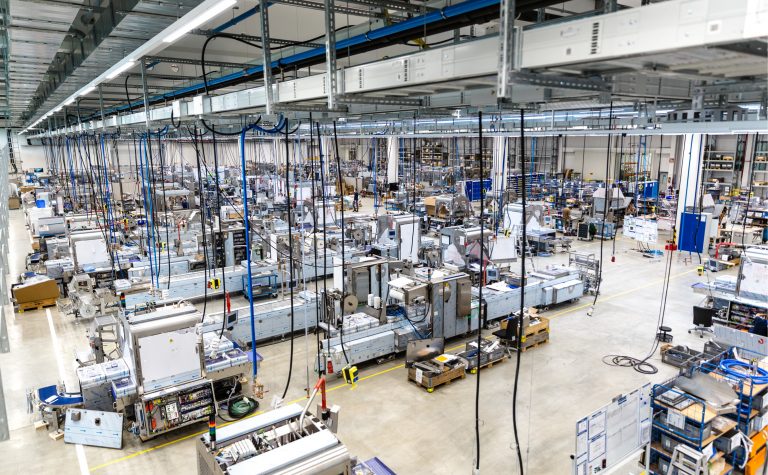 Zu den jüngsten Investitionen zählt der Bau einer Brunnenanlage am Firmenhauptsitz in Wolfertschwenden. Früher hat das Unternehmen dort seine Laserbearbeitungsmaschinen elektrisch gekühlt – mit aktiven Kühlaggregaten, die direkt an Maschinen angegliedert und energieintensiv waren. „Um Strom und CO2-Emissionen einzusparen, kommt heute für die Kühlung der Maschinen Brunnenwasser zum Einsatz“, erklärt Moritz Naumann, Projektingenieur bei MULTIVAC. Gleich vier Brunnen mit einer Tiefe von 32 Metern habe das Unternehmen auf dem Firmengelände bauen lassen. Pumpen befördern das Grundwasser, das zwischen 8 °C und 11 °C kalt ist, an die Oberfläche. „Wärmetauscher übertragen die Kälte im nächsten Schritt an ein Kaltwassernetz. Über ein Rohrsystem gelangt das gekühlte Wasser schließlich zu den Laserbearbeitungsmaschinen. Da die energieintensiven Kühlaggregate entfallen, sparen wir jährlich 61.800 kWh Strom und 25 Tonnen CO2.“ Das Brunnenwasser kühlt aber nicht nur Maschinen. Es klimatisiert auch einen Teil der rund 10.000 Quadratmeter großen Fertigungshalle. Dort kommen Umluft-Kühltürme zum Einsatz, die an das Kaltwassernetz angeschlossen sind. Die Türme saugen Frischluft an, kühlen die Luft über das kalte Wasser und geben die konditionierte Luft in die Halle ab.