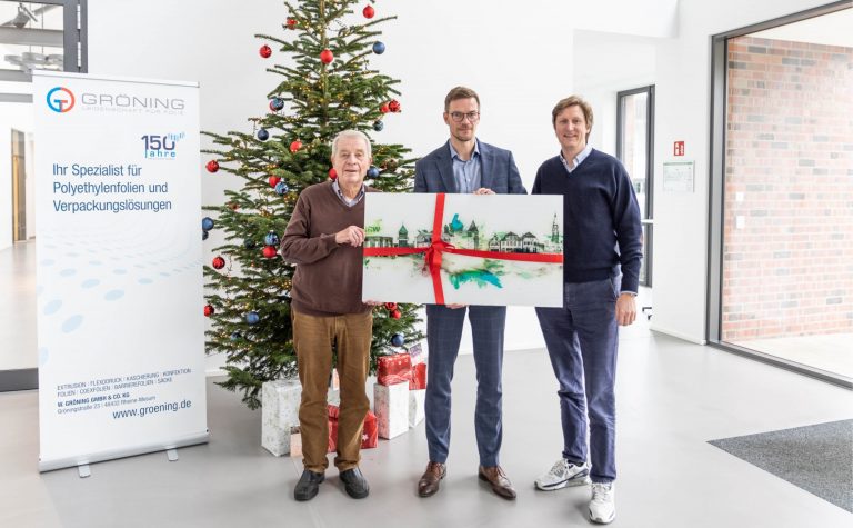 Bei dieser langjährigen Geschichte am Standort gibt es selbstverständlich mannigfaltige Verbindungen zur Verwaltung und zur Wirtschaftsförderung. In diesem Zusammenhang freut sich EWG Geschäftsführer Ingo Niehaus besonders, dass er im kleinen Rahmen zum 150 Jahre Jubiläum gratulieren kann und übergab ein kleines Geschenk in Form einer modernen Ansicht der Stadt Rheine an Rudolf Kölling-Gröning und Matthias Becker-Gröning. Beide repräsentieren die Geschäftsführung in der 4. und 5. Generation. Die Firma Gröning beschäftigt ca. 160 Mitarbeiter:Innen in Rheine-Mesum.