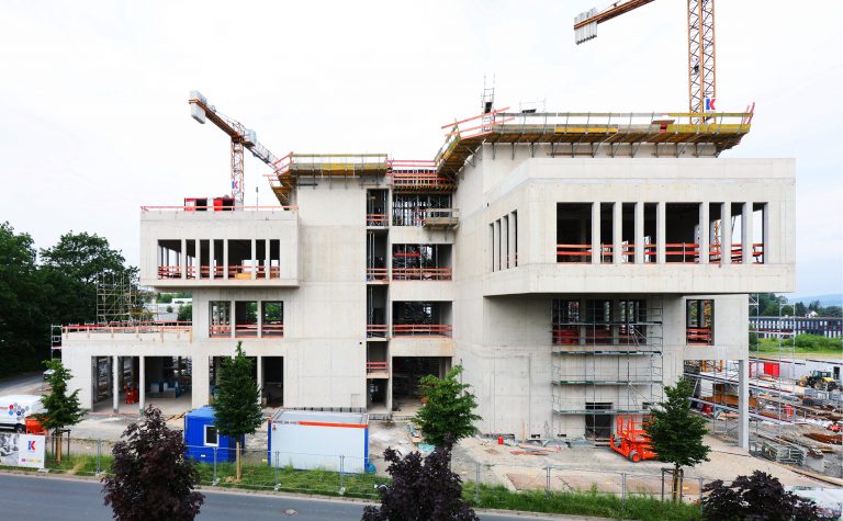 Mittwoch, 07.07.21 Lemgo. Der Rohbau des InnovationSPIN, ein Gemeinschaftsprojekt der Kreishandwerkerschaft Paderborn-Lippe, dem Kreis Lippe und der Technischen Hochschule Ostwestfalen Lippe, ist fast fertig. Die „flügelartigen“ Ausleger, die dem Gebäude auch ihren Namen geben (engl.: spin-sich drehen), sind jetzt deutlich zu erkennen. So ragt z.B. über die Bunsenstraße ein Ausleger, in dem unter anderem das Innovationslabor Gesundheits- und Produktionstechnologie der TH OWL seinen Platz haben wird.